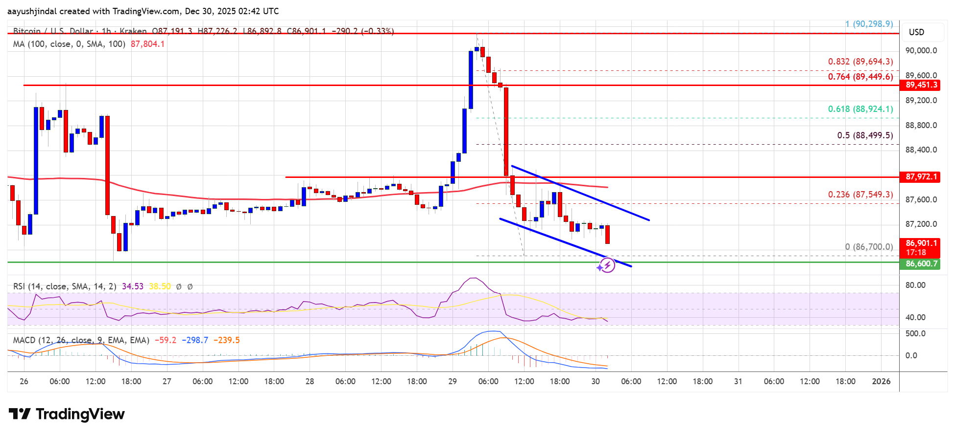 • The price is trading below $88,000 and the 100 hourly Simple moving average.