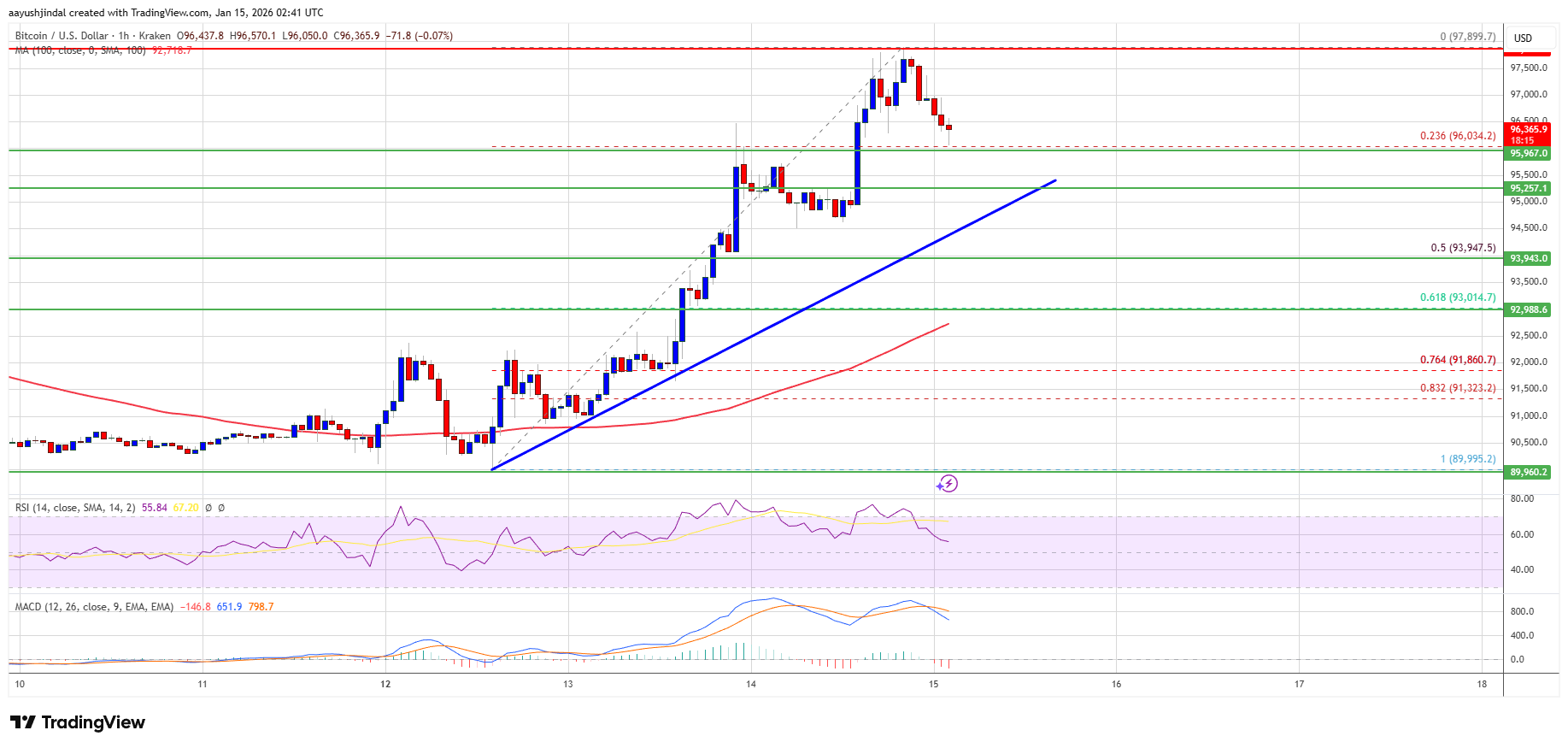 Bitcoin is now trading above $96,000 and the 100 hourly Simple moving average. If the price remains stable above $95,500, it could attempt a fresh increase. Immediate resistance is near the $97,200 level. The first key resistance is near the $97,800 level.